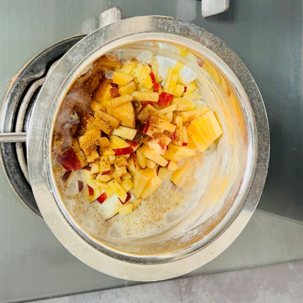 - Reduce the heat and stir in chopped apple, cinnamon and vanilla extract.1 Medium Apple, 1 Teaspoon Vanilla Extract, ½ Teaspoon Cinnamon
