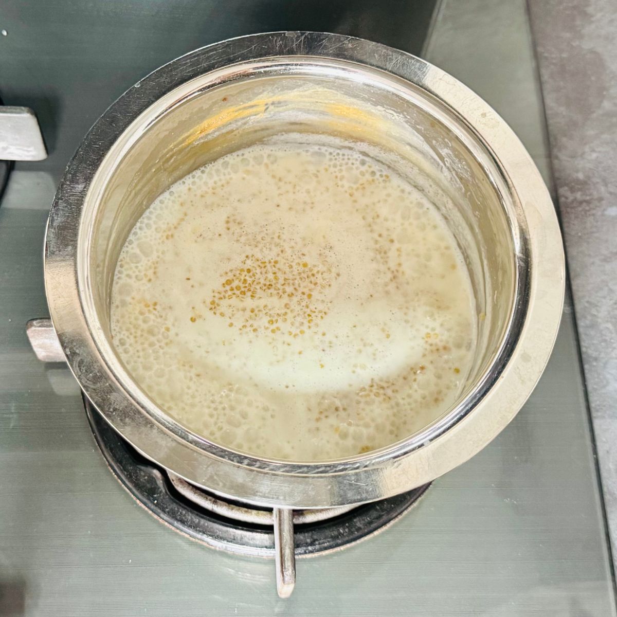 Thickness: The cooked porridge should have a medium-thick consistency. It will thicken further as it cools. If the porridge turns out too thick, stir in a splash of warm milk to loosen it. If it is too thin, heat it a little longer until it reaches your desired consistency.