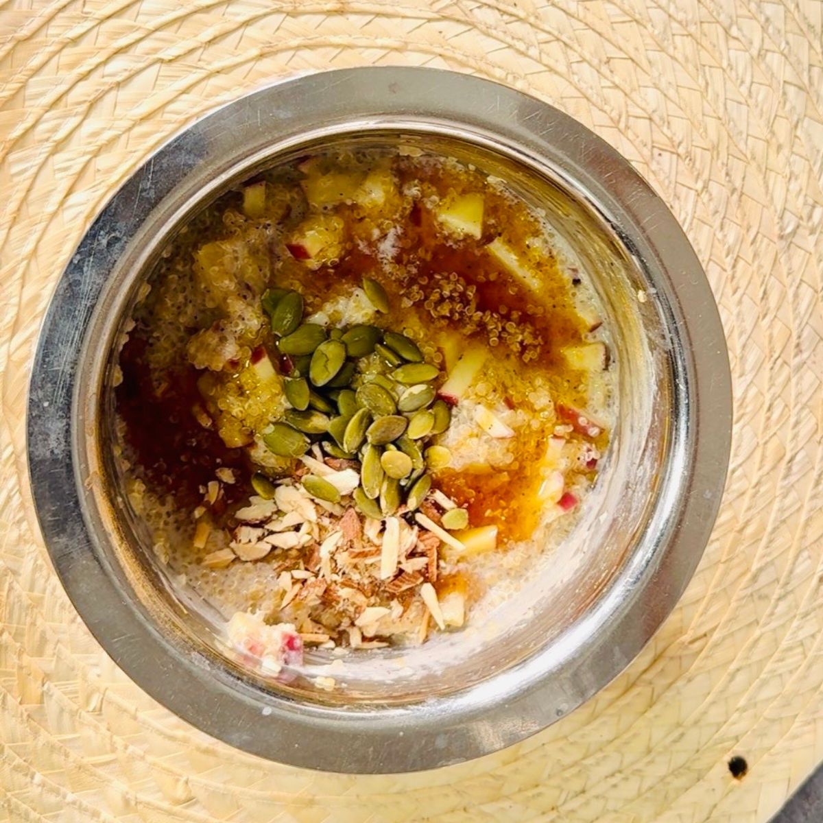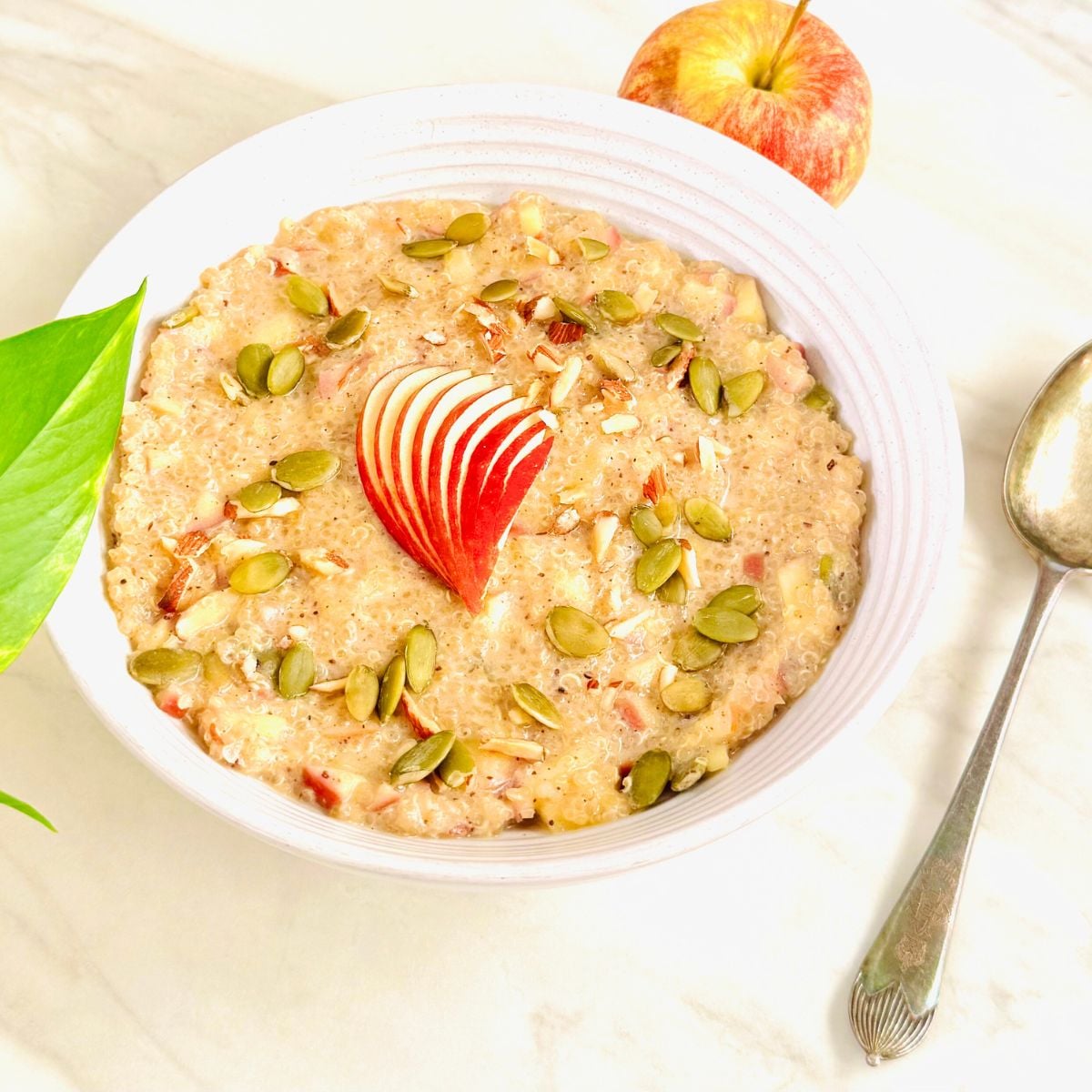 - Enjoy nutritious and delicious apple quinoa breakfast porridge topped with apple slices, almonds and pumpkin seeds.