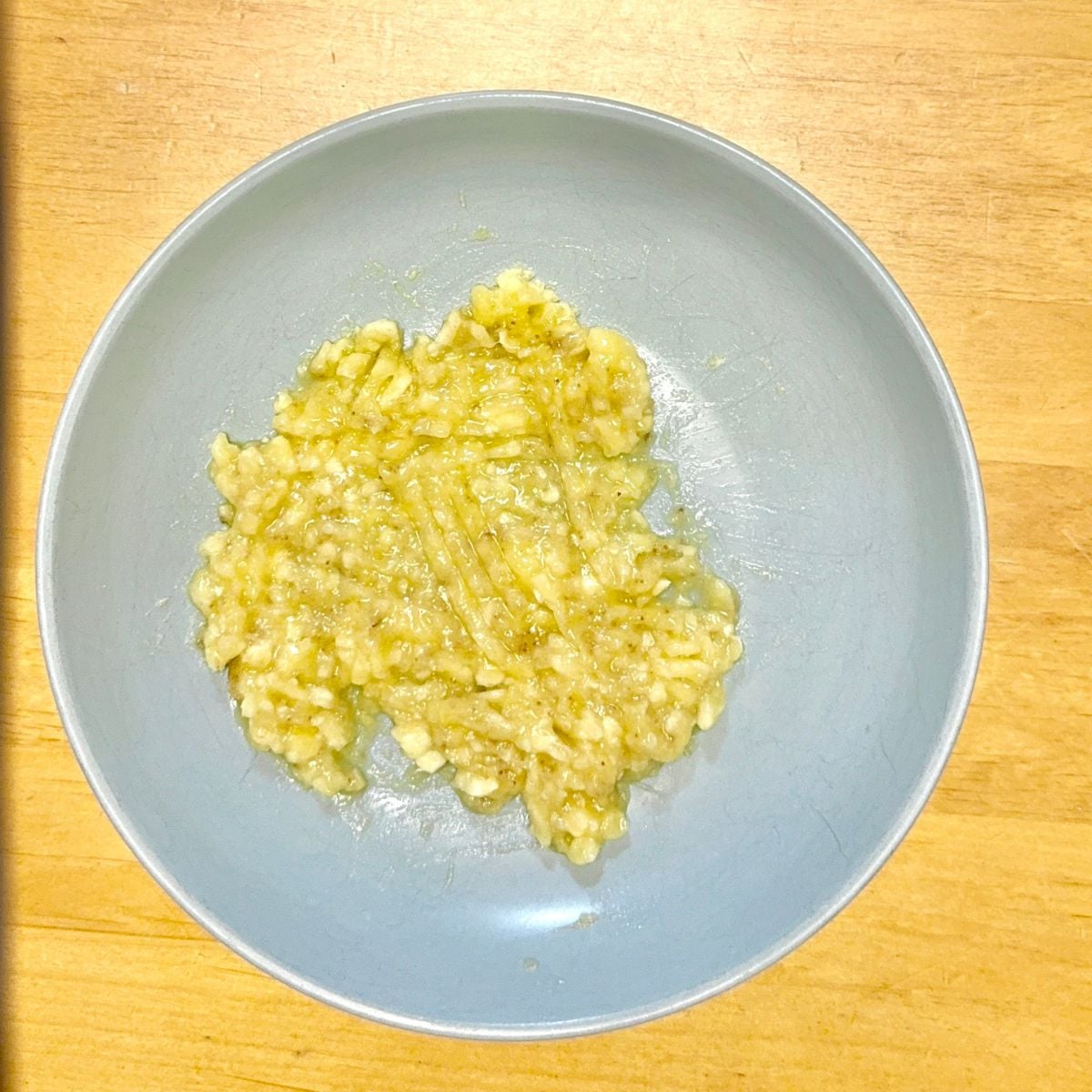 - In a bowl, place 2 bananas and mash with a fork until smooth.