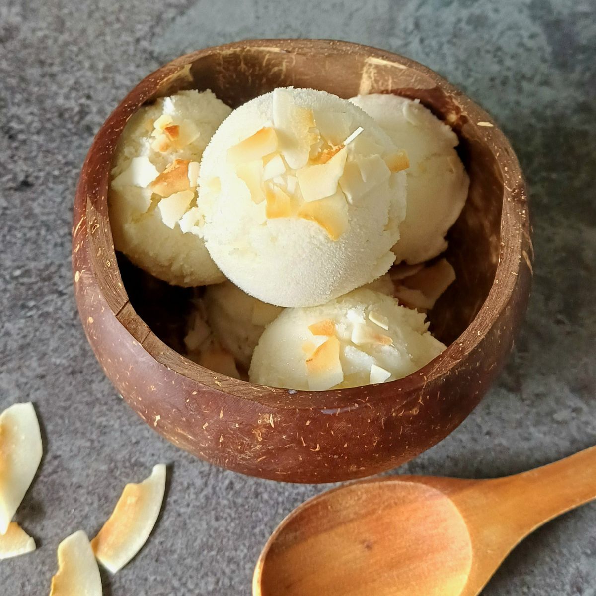- Scoop out the desired portion, sprinkle handful toasted coconut flakes and enjoy the creamy coconut milk ice cream.Handful Toasted Coconut Flakes