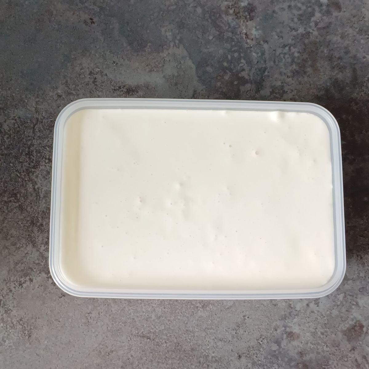 - Cover the tub with cling wrap, pressing it gently so that the wrap touches the surface of the coconut mixture.