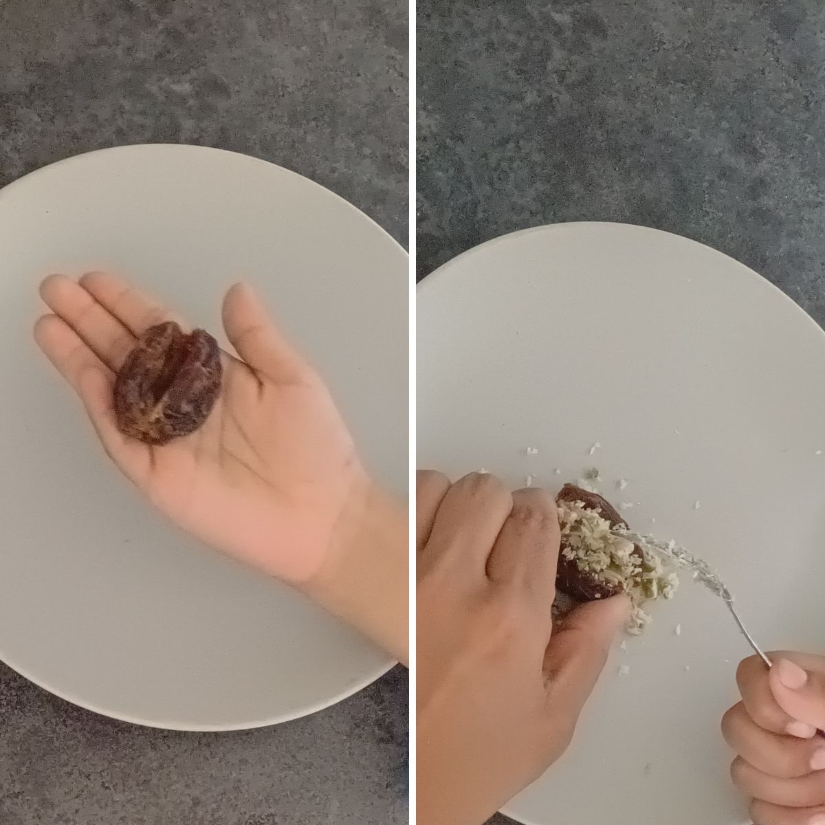 Step 6: Place the stuffed dates on a plate and repeat the process for the remaining dates.