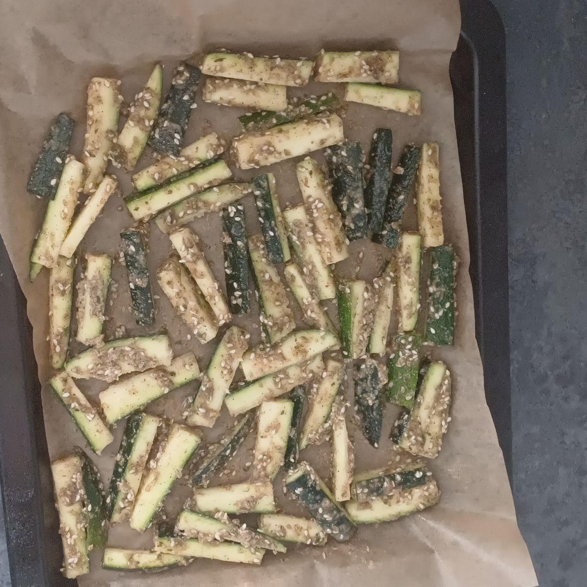 - Arrange coated zucchini sticks on a lined baking sheet in a single layer.