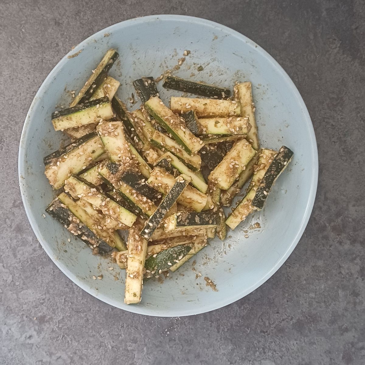 - Add zucchini sticks and toss well until every stick is coated well with the sesame mixture.1 big Zucchini