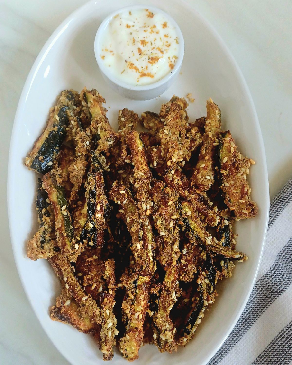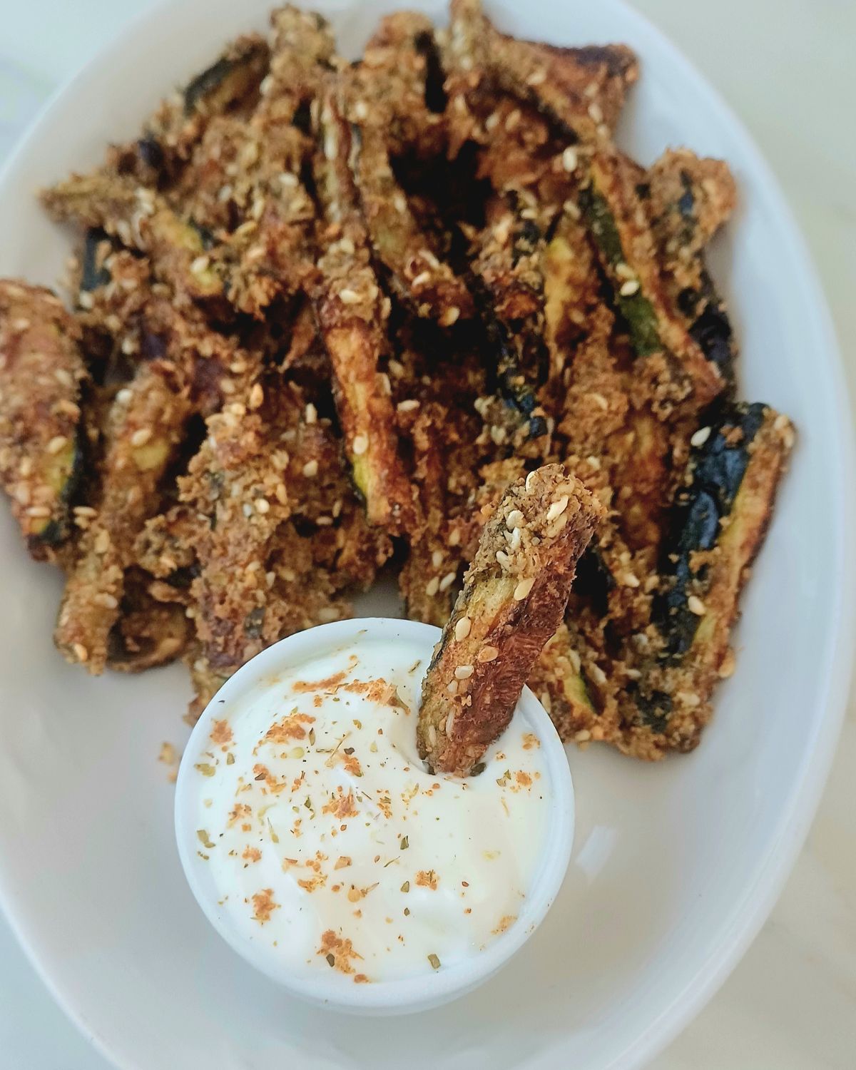 - Serve hot and delicious crunchy baked sesame zucchini sticks with yogurt herb dip, spicy yogurt sauce or honey mustard sauce.