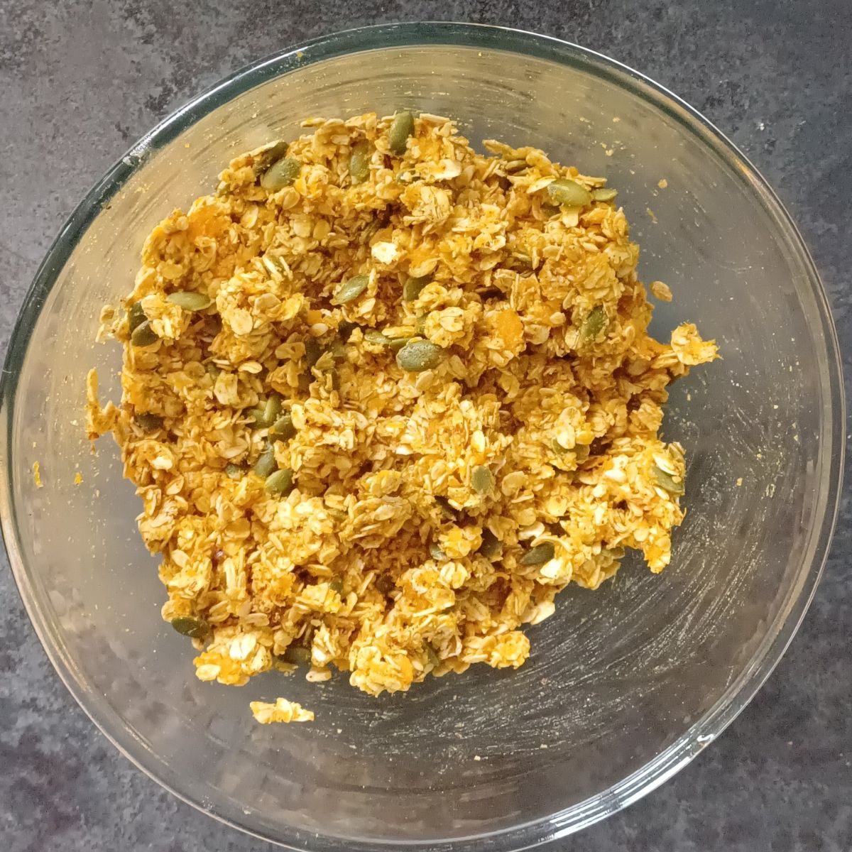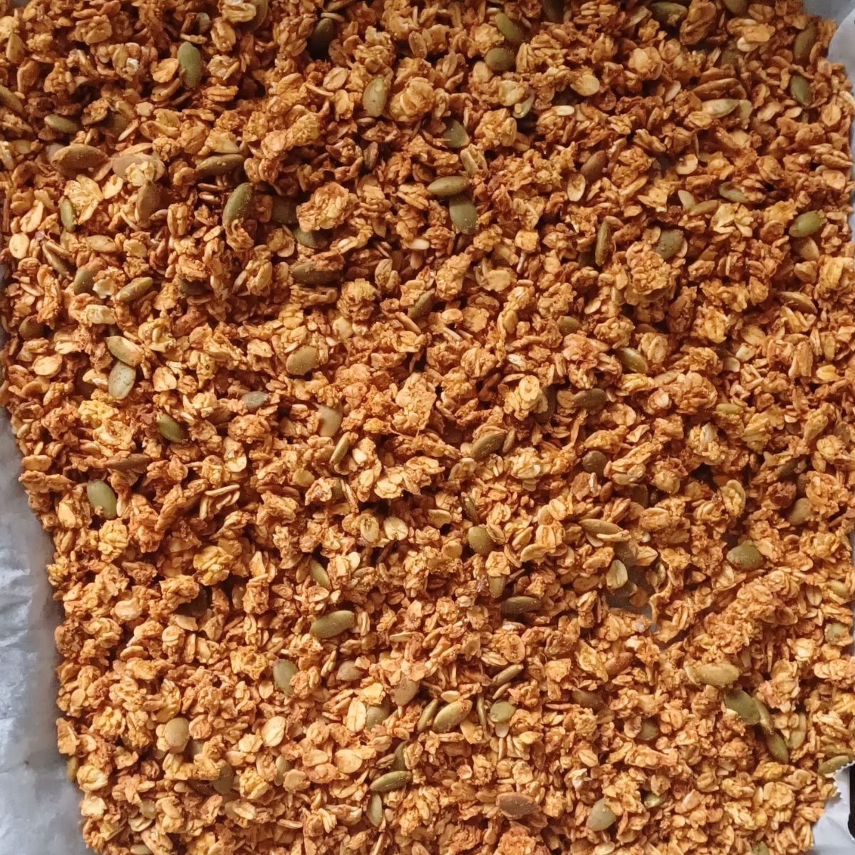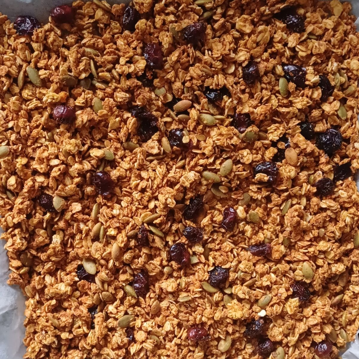 Try this homemade, wholesome and irresistibly crunchy pumpkin maple granola. This cosy dish is packed with warm spice, real pumpkin and natural sweetener. It is vegan, nut free and perfect for breakfast or snack.