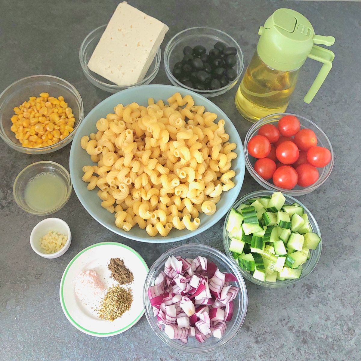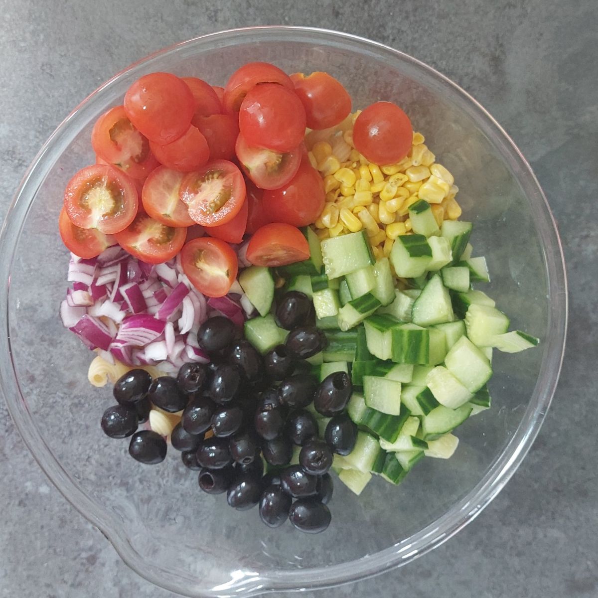 Step 3: In a large bowl, combine cooked pasta, cucumber, boiled corn, cherry tomatoes, red onion and olives.