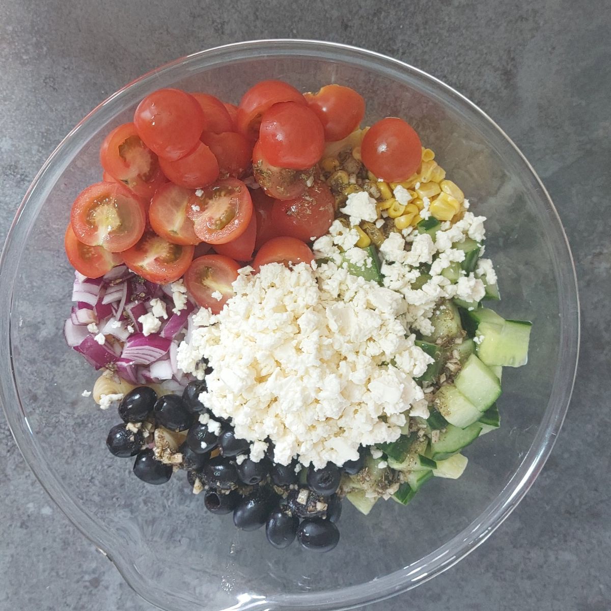 - In a large bowl, combine cooked pasta, cucumber, boiled corn, cherry tomatoes, red onion and olives.