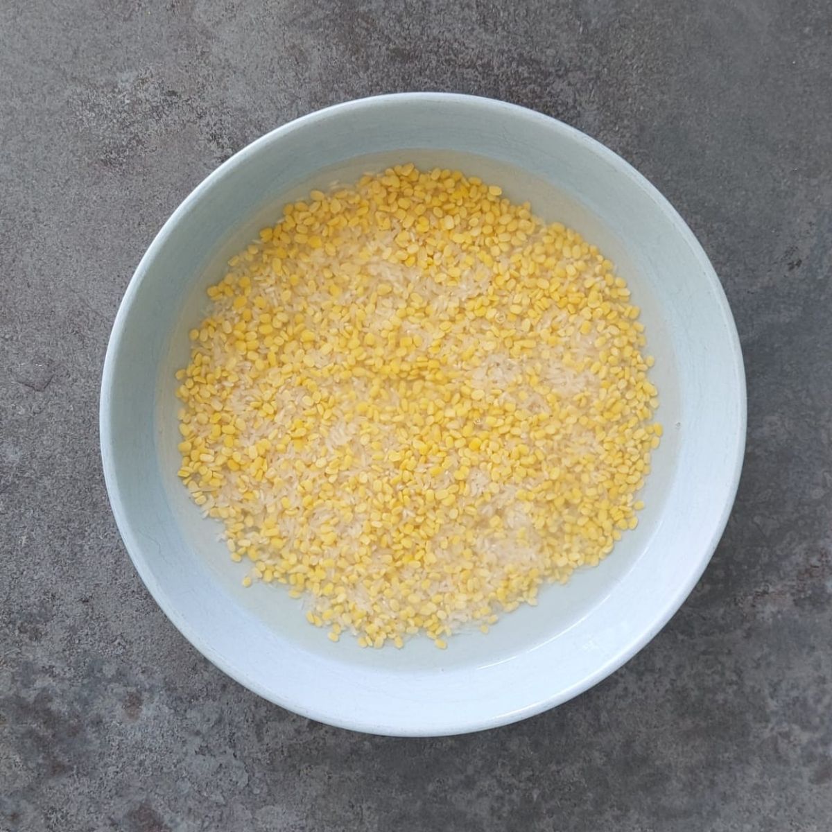 - Rinse and wash the lentil and rice with cold water 3-4 times. Soak them in sufficient water for 20 minutes.½ Cup Sona Masoori Rice, ½ Cup Moong Dal/Small Yellow Lentils