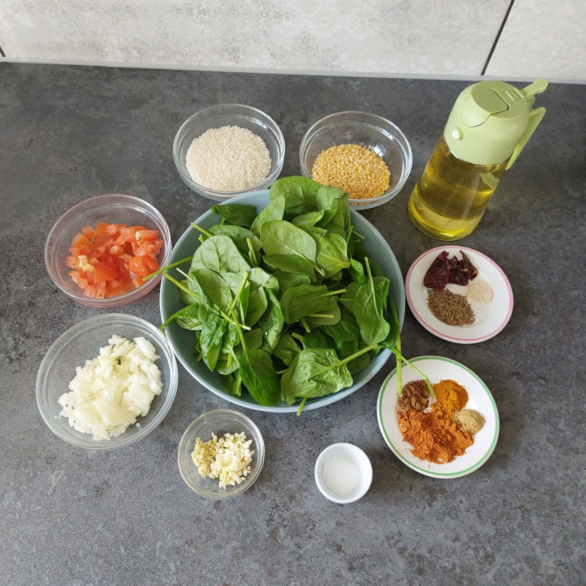 Moong dal palak khichdi is a nutritious dish made with moong dal, rice, spinach and spices. It is a vegan dish and makes a perfect comforting weekday meal with raita and pickle.