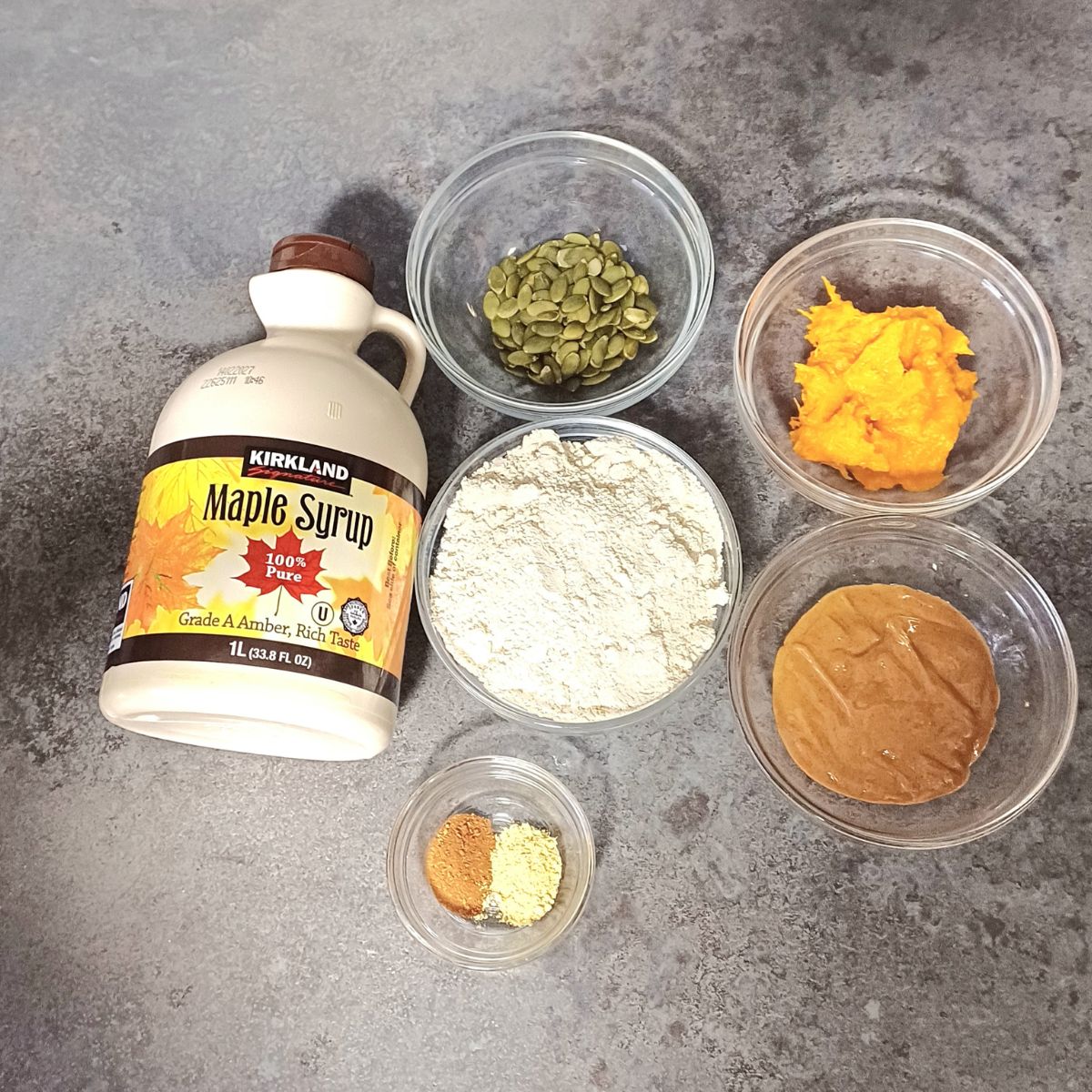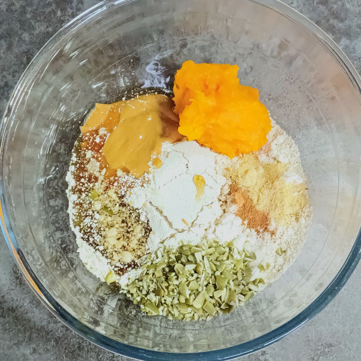 Step 1: In a mixing bowl, place oat flour, pumpkin puree, peanut butter, maple syrup, ground cinnamon, ground dry ginger and pumpkin seeds.
