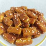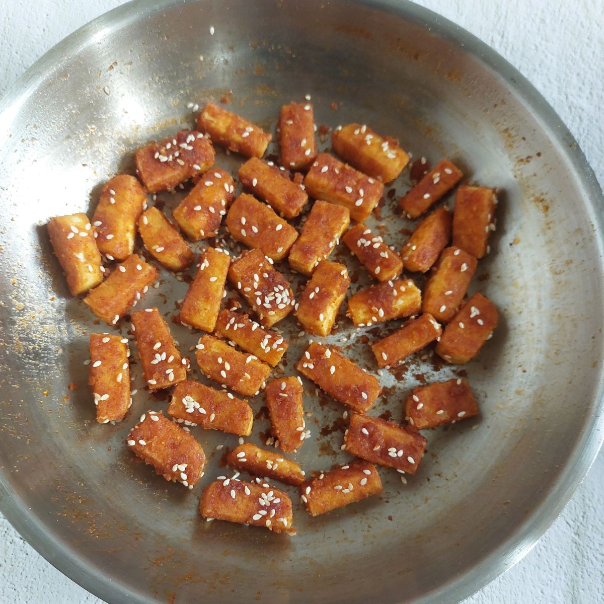 Tofu cubes are coated with a flour mix, pan fried until crispy and golden brown and then tossed in a spicy mixture and sesame seeds. It is so irresistible that you can’t stop at one bite.