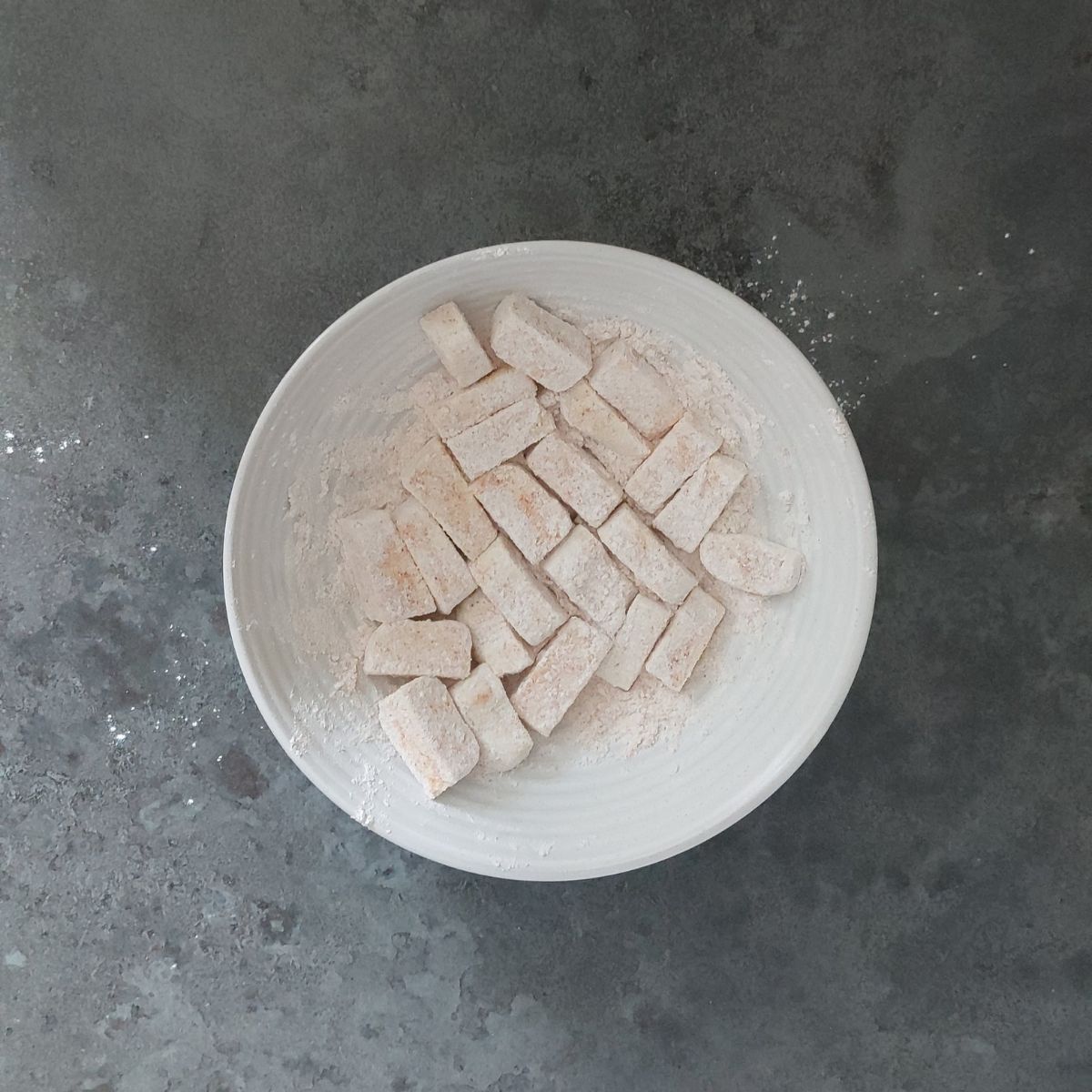 Step 4: Toss tofu cubes in flour mixture and make sure each cube is well coated on all sides.