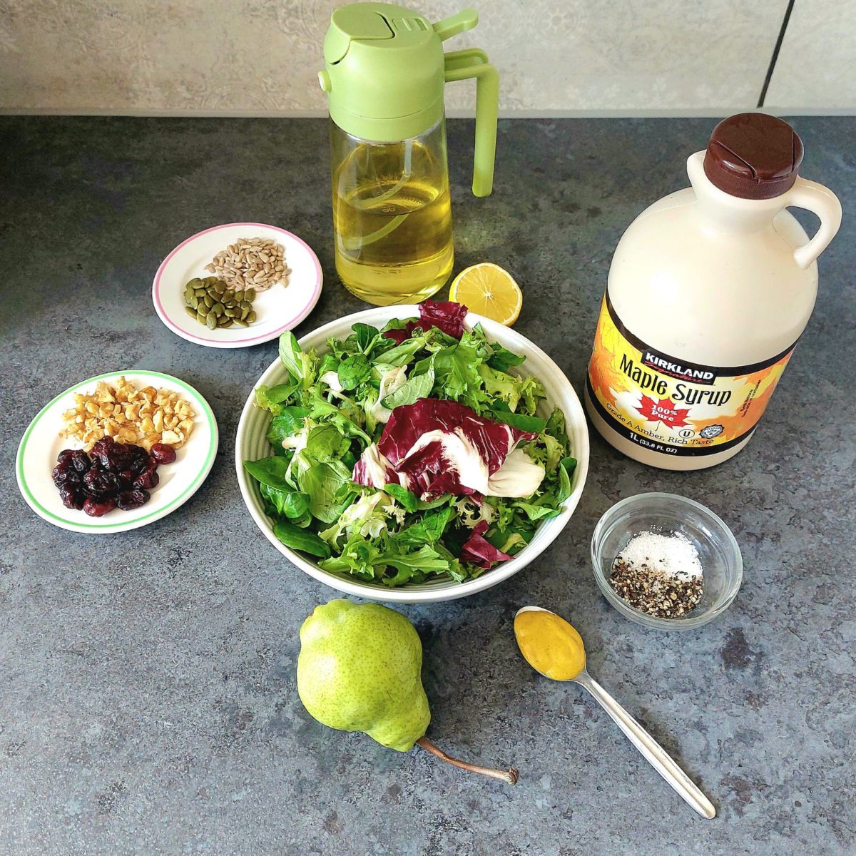 - For Dressing: Olive oil, lemon juice, mustard, salt, pepper and maple syrup.