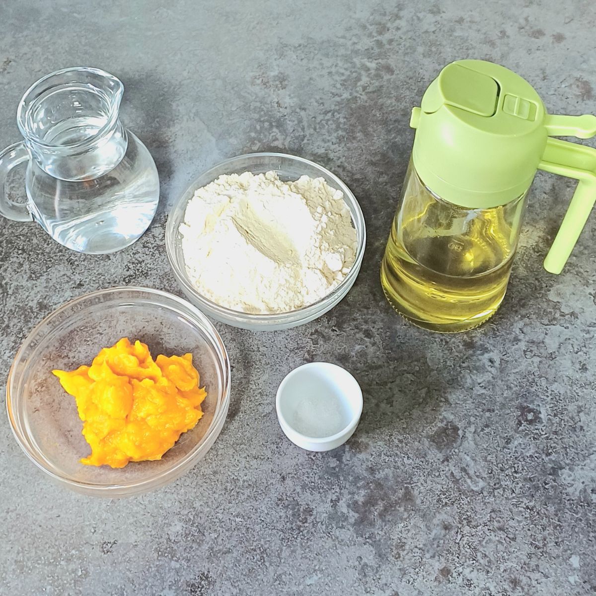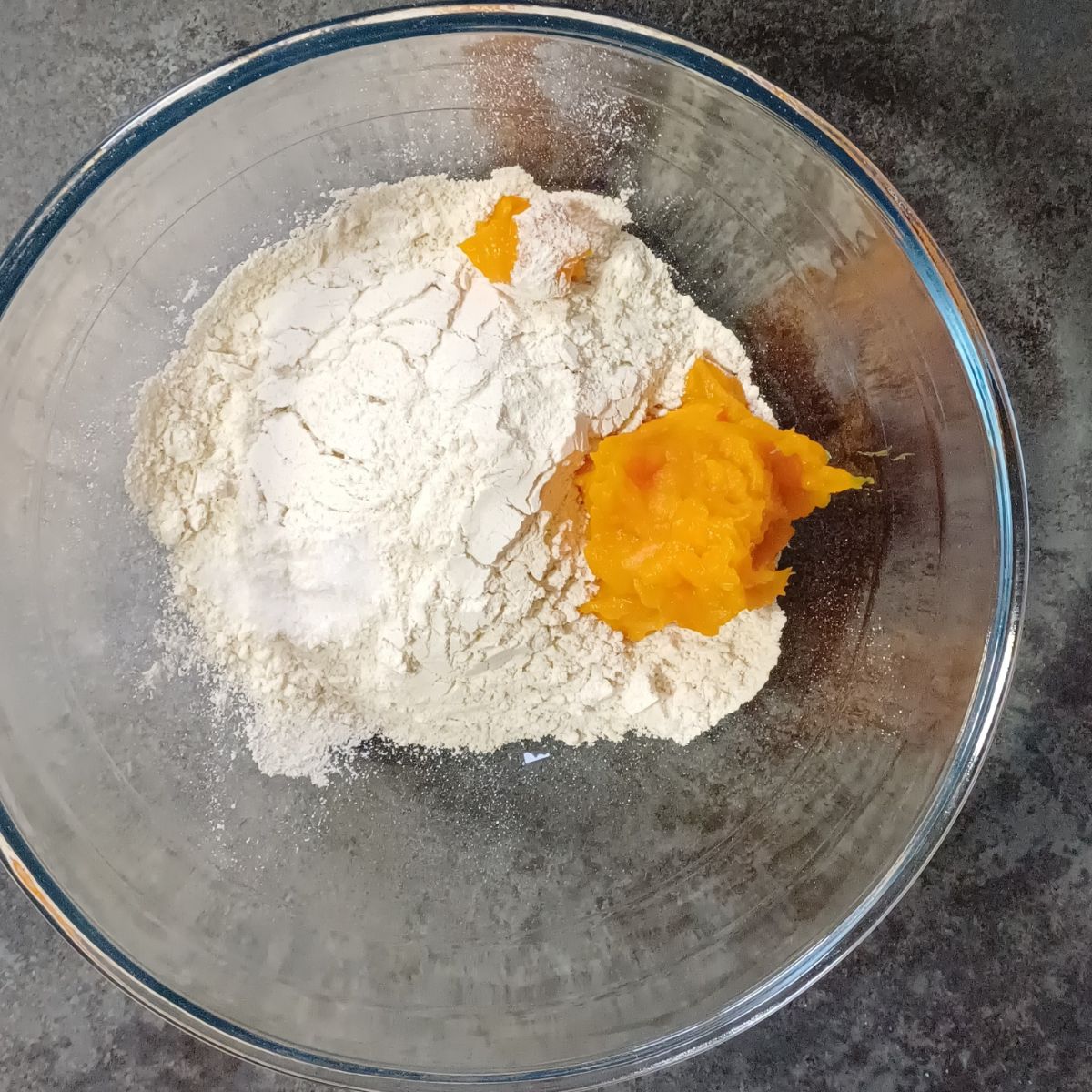 Step 1: In a mixing bowl, combine wheat flour, pumpkin puree and salt.