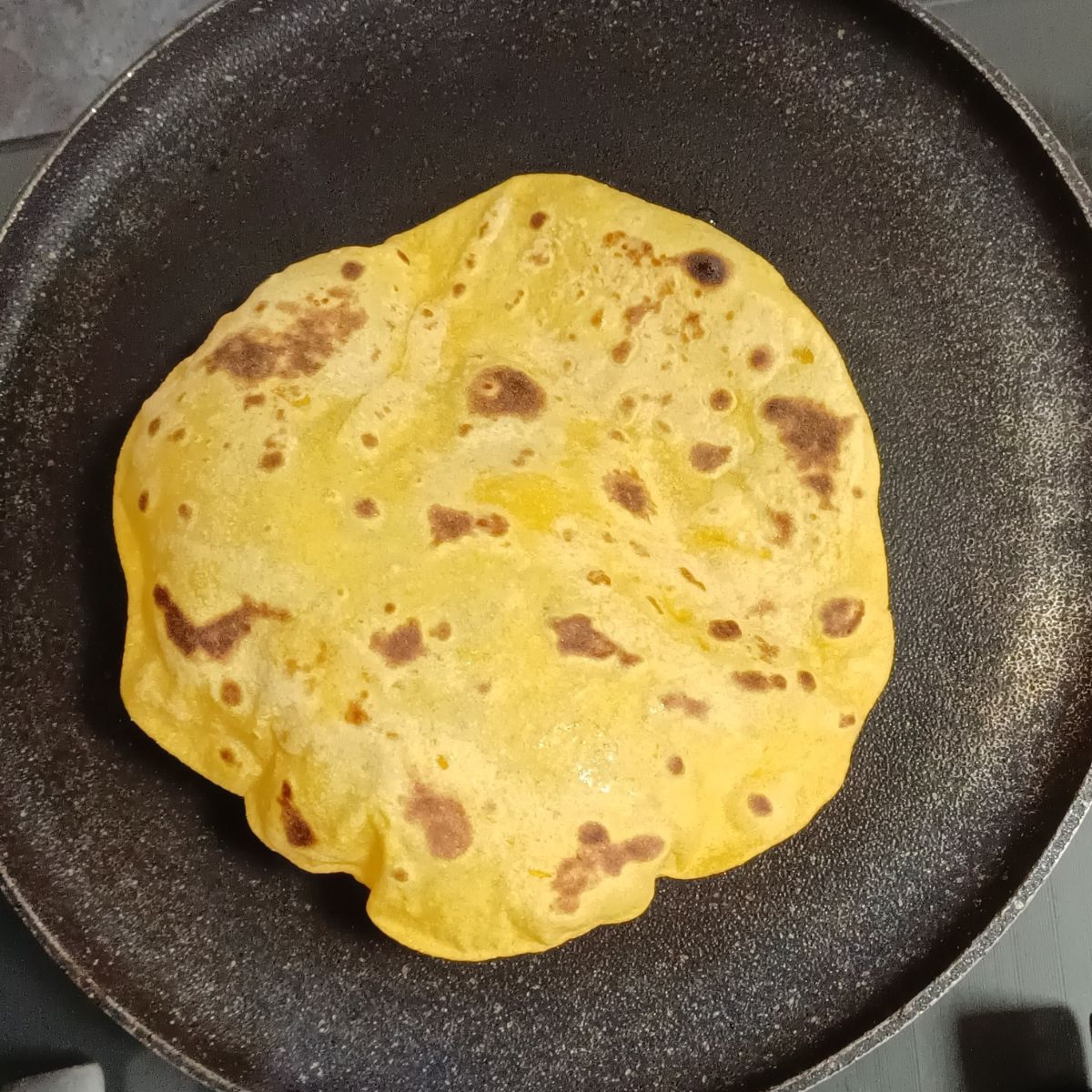 Step 14: Apply a few drops of oil both sides and cook until roti puffs up and brown spots appear.